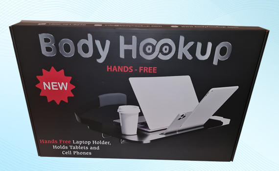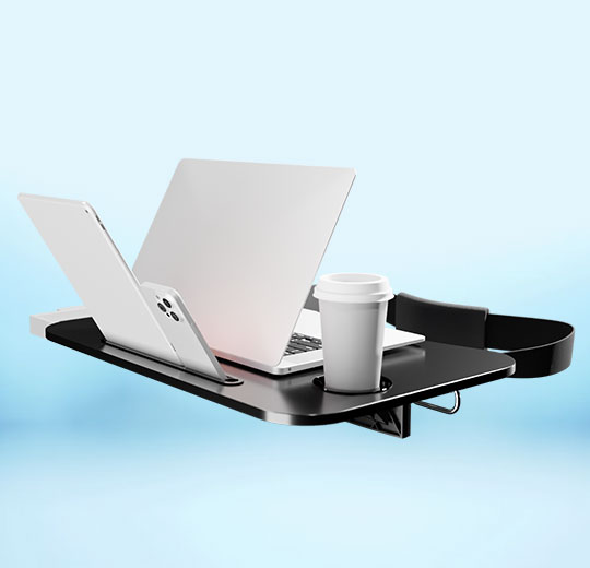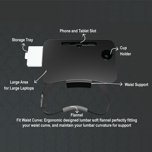 The tabletop also includes a pullout tray to accommodate any accessories or small items that need to be or is preferably positioned beside the portable device. The position-locking mechanism positions and secures the desired orientation of the tabletop with the support belt, and consequently the torso of the user. The tabletop freely rotates about the support belt and is easily locked into a desired position.