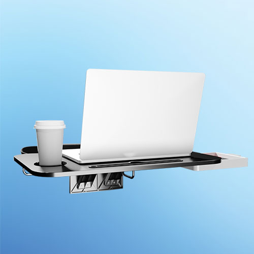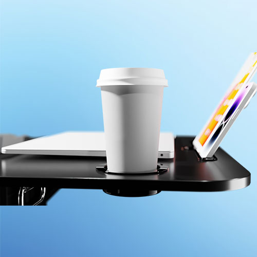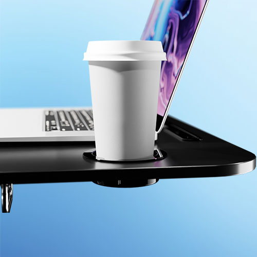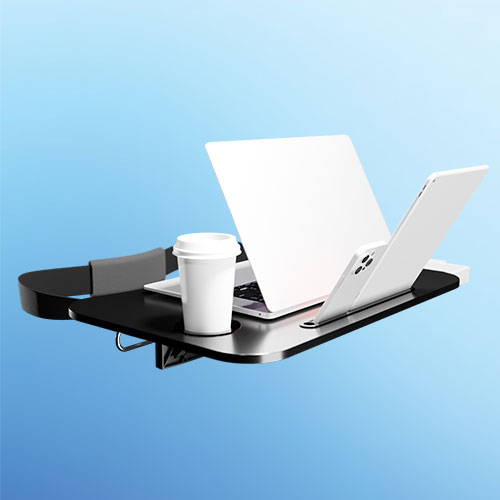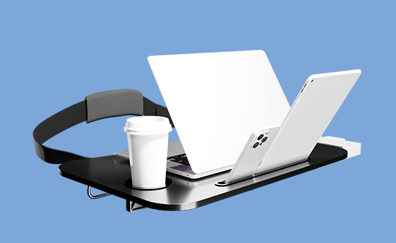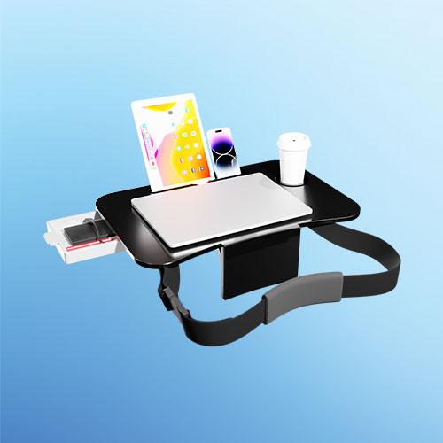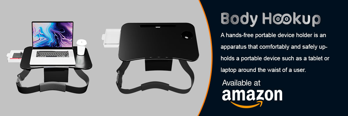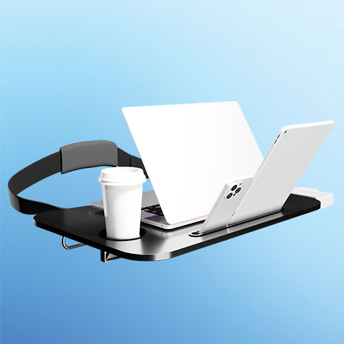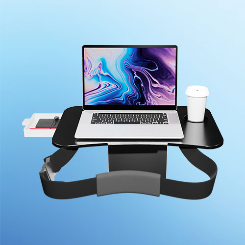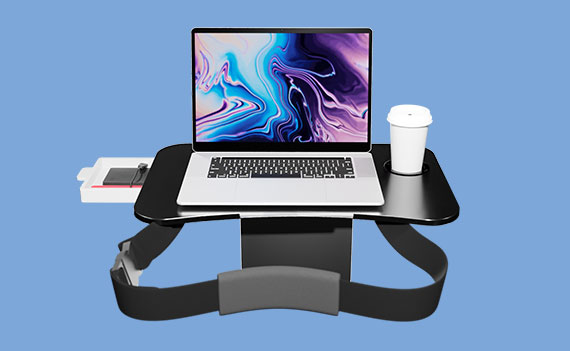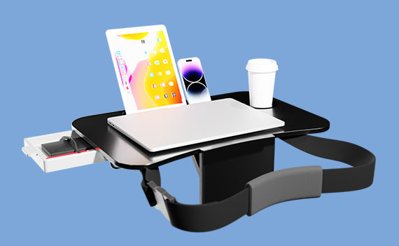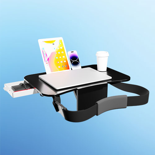 The tabletop also includes a pullout tray to accommodate any accessories or small items that need to be or is preferably positioned beside the portable device. The position-locking mechanism positions and secures the desired orientation of the tabletop with the support belt, and consequently the torso of the user. The tabletop freely rotates about the support belt and is easily locked into a desired position.